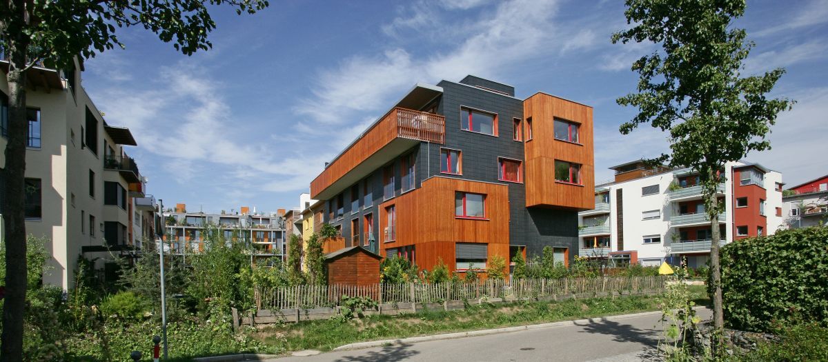 Ein beeindruckendes Beispiel für den Einsatz von Schiefer als Baumaterial wurde bereits im Jahr 2009 im Freiburger Stadtviertel Vauban umgesetzt. Das zukunftsorientierte Gebäude hatte sich damals am geltenden EnEV orientiert und die gesetzlichen Vorgaben sogar weit übertroffen und tun dies bis heute. In dem ökologischen Wohnquartier war unter der Planung des Architekten Ulrich Mayer ein viergeschossiges Haus für eine Baugruppe mit sieben Familien entstanden. Hinter der schimmernden Schieferfassade aus Rathscheck Schiefer verbergen sich Eigentumswohnungen im Passivhausstandard. Die vorgehängte, hinterlüftete Schieferfassade ist zweilagig und insgesamt 260 mm dick gedämmt.