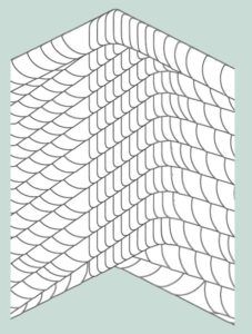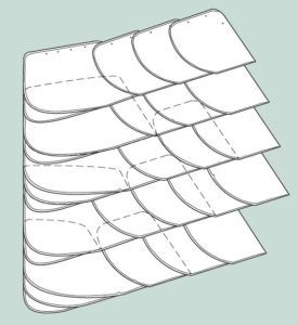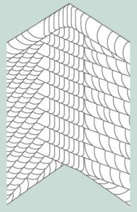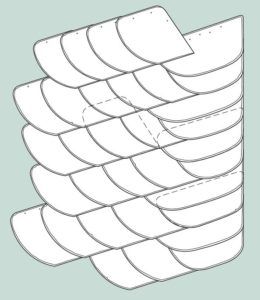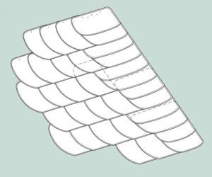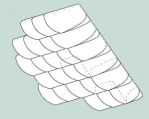 Typisch für die Altdeutsche Deckung ist der Wechsel zwischen breit und schmal zugerichteten Decksteinen innerhalb der Gebindereihen. Die Details für Kehlen, Grate,