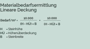| Höhe und Breite [cm] | ca. Schiefer- | Haken- verbrauch [Stück/m²] | Haken- länge [cm] | Latten- abstand [cm] bei 6 cm HÜ | ca. Latten- verbrauch [m / m²] | ca. kg |