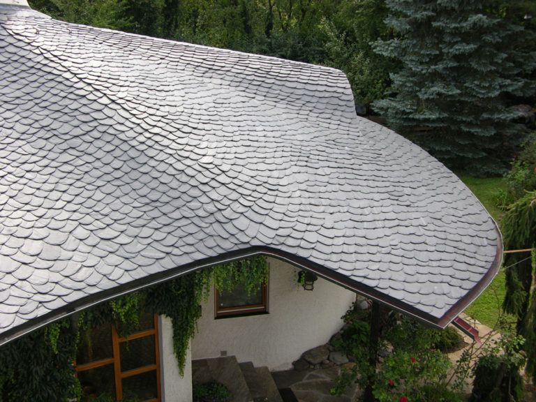 Die Befestigung der Schiefer erfolgt mit 2 korrosionsgeschützten Schiefernägeln oder -stiften bzw. DrillSklent-Schrauben im Kopfbereich. Ab Steingröße 50 x 25 cm zusätzlich mit einem Einschlaghaken. Beim Verwenden von Blechen ist unbedingt darauf zu achten, diese mit einem Wasserfalz zu versehen.