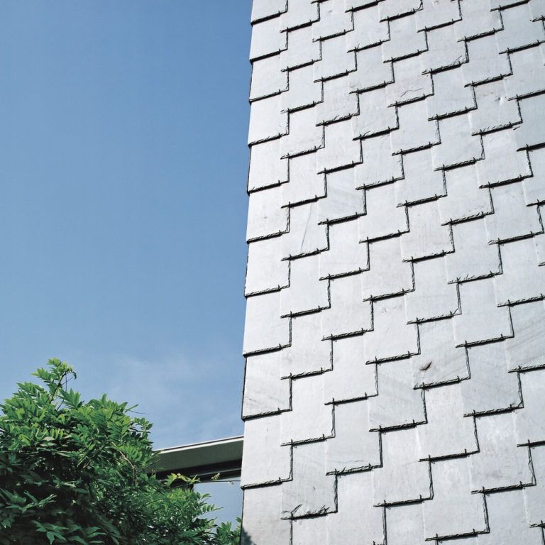 Especially big façade surfaces receive their individual character by the pinpoint application of the fishscales. The typical arch form of the cap-sone enables the arising of a dynamic covering design.