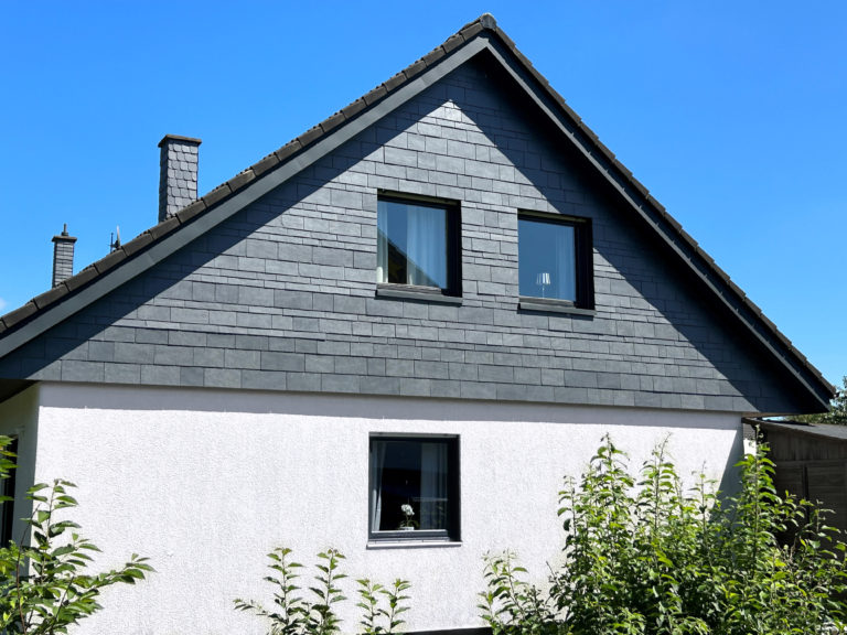 Das große rundliche Dach, eingedeckt in Wilder Deckung aus Moselschiefer® von Rathscheck, tragen mittig zwei kräftige Eichenstämme. Zusammen mit den weitgehend unbearbeiteten Sparren bilden sie das von innen sichtbare Dachtragwerk. Oberhalb der Sichtschalung liegt zwischen 18 cm hohen Hilfssparren Mineralwolle und darüber ein 4 cm hoher Lüftungsraum. Die imposante Dachbelüftung, die im Verhältnis zum First eine sehr lange Traufe entlüften muss, avancierte zusammen mit dem runden Schornstein zum reizvollen Gestaltungselement der Dachlandschaft. Das Dach besitzt keine Regenrinne, so wird der Fall des Regenwassers als Regensaum rund um das Haus als Naturerlebnis zelebriert. Ein breites, reizvoll gestaltetes Kiesbett nimmt die Fluten auf.