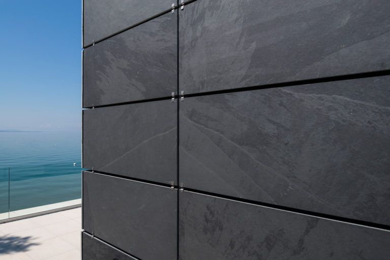 Ebenso ungewöhnlich ist auch das am gesamten Haus durchgehende Rastermaß von 16 Zentimetern, das subtil den modernen, geradlinigen Charakter der Architektur unterstreicht: „Im Bereich des Daches kamen aufgrund der gewählten Doppeldeckung und der erforderlichen Höhenüberdeckung von 24 Zentimetern entsprechend 40 cm x 40 cm große Schiefersteine zum Einsatz, um im Ergebnis eine sichtbare Höhe von 16 Zentimetern zu erhalten“, erläutert Rolf Hesse. „Die Steine der dritten Reihe überdecken die Steine der ersten Reihe dabei um acht Zentimeter. An der Fassade haben wir alternativ 40 cm breite und 20 cm hohe Steine in Einfachdeckung mit einer Höhenüberdeckung von vier Zentimetern verarbeitet, um das gewünschte Rastermaß umzusetzen. Der als Fugenhinterlegung eingefügte Metallstreifen stellt dabei sicher, dass kein Wasser durch die drei bis sechs Millimeter breite Stoßfuge in die Konstruktion eindringen kann.“
