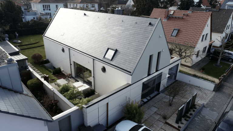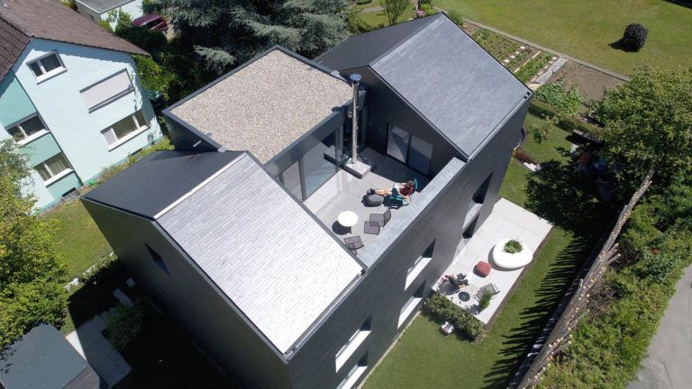 Die Bauherren stammen aus einer traditionsreichen Dachdeckerfamilie. Die Vorliebe zu dem natürlichen Spaltgestein Schiefer deckte sich an diesem Objekt besonders gut mit den Gestaltungsideen des Architekten. Statt klassischer Deckarten wie der Altdeutschen Deckung oder der Schuppen-Deckung entschied man sich bei diesem Objekt für die moderne Dynamische Deckung. Diese von Rathscheck Schiefer entwickelte Rechteckdeckung wurde inzwischen in die Fachregeln des ZVDH aufgenommen. Der Architekt entwarf eine Schieferfassade aus 35, 40 und 50 cm langen Steinen. Daraus entstand eine Dynamische Deckung mit Gebindehöhen von 5, 10 und 15 cm. Die Ecken wurden sauber eingekemmt und die Fassadenflächen an den Fenstern gegen dunkle Zargen gearbeitet. Die Schieferfassade im Passivhausstandard ist auf eine Vollholzschalung genagelt und über senkrechte Hölzer und Aluminium-Tragtraversen in den schlanken Betonwänden verankert. Dazwischen befindet sich in zwei Lagen 22 cm Mineralwolle. Die handwerklich gekonnt ausgeführte Schieferfassade erweist sich immer wieder als Publikumsliebling. Architekt Ahrens dazu: „Diese Fassade finden alle gut. Sie ist der Hammer“.