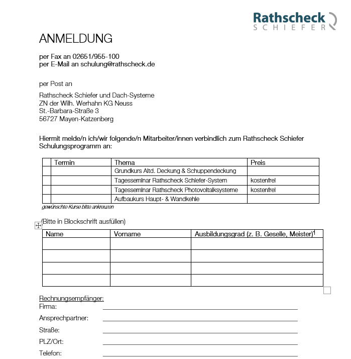 Im Rahmen unseres Schulungsprogramms bieten wir, gemeinsam mit der Dachdeckerschule in Lehesten, neben unseren kostenfreien Tagesseminaren zum Rathscheck Schiefer-System und unseren Photovoltaiksystemen, nun auch umfangreiche Grund- und Weiterbildungskurse zu klassischen Deckarten und Anschlussdetails.
